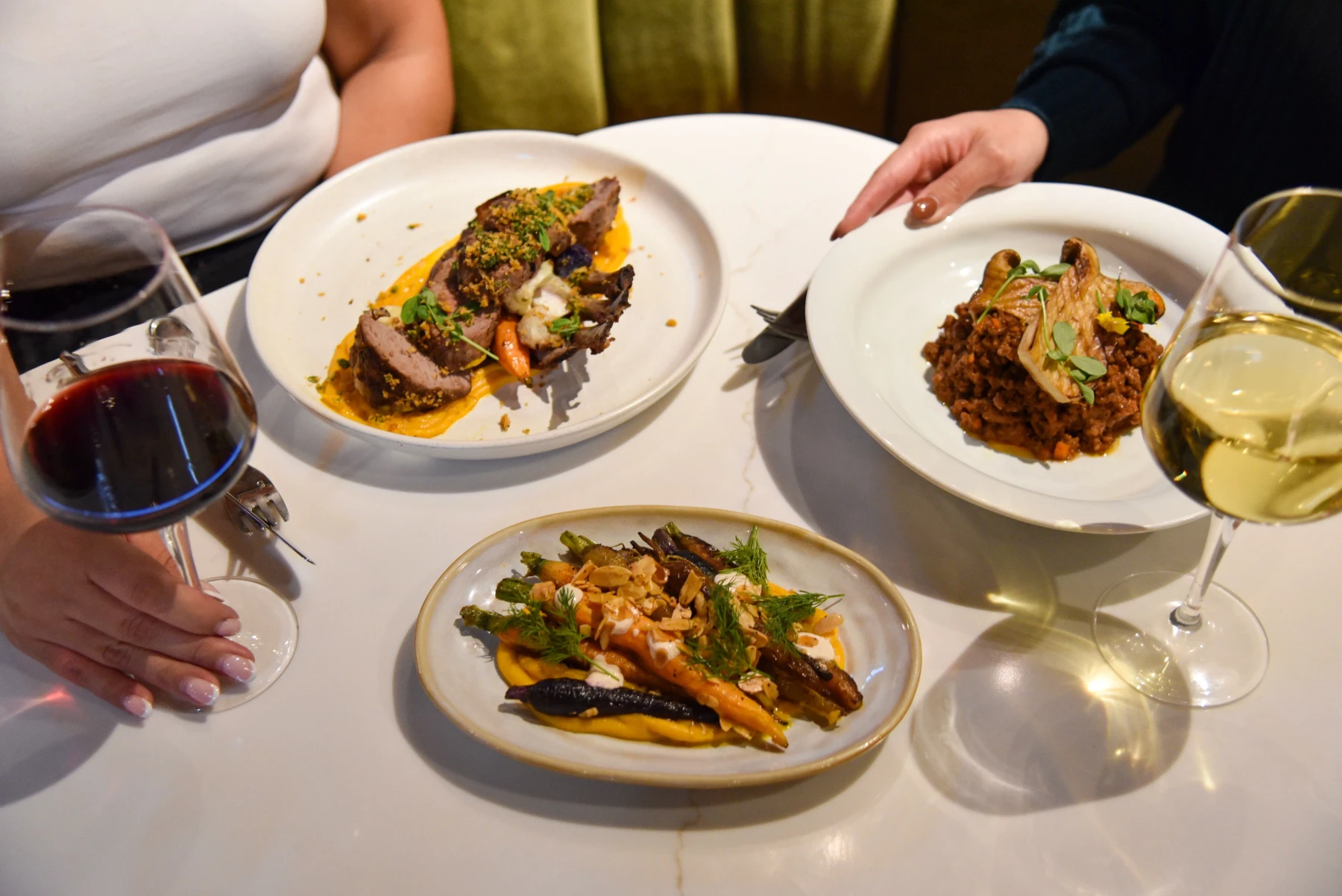 roasted acorn squash, fall harvest vegetables, pecan gremolata, pomegranate seeds, creamy carrot purée, mashed potatoes, and truffle honey drizzle